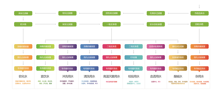 醫(yī)院的水源絕大部分都來自于市政自來水,雖然原水的指標已符合《生活飲用水衛(wèi)生標準》,但醫(yī)院很多專業(yè)科室都需要對原水進行水質(zhì)處理才能達到實際使用要求。