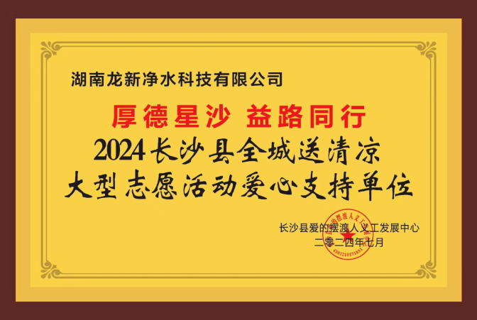 龍新凈水作為一家水處理整體解決方案智造商,積極響應“厚德星沙,益路同行”全城送清涼大型志愿活動,充分發揮水處理專業特長優勢,向此次活動捐贈了一批優質的礦泉水。當他們接過清涼的礦泉水,臉上露出的那一抹欣慰的笑容,讓我們深深感受到,這一份小小的心意,帶來的是大大的溫暖。
