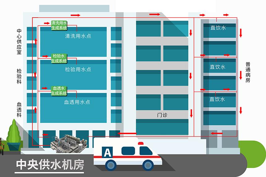 所謂中央集中制水、分質供水,就是用一套水機對自來水進行深度處理,使其達到各科室可直接使用的水質標準
