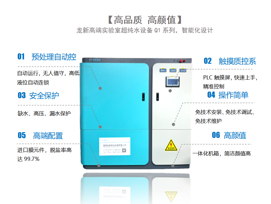 實驗室超純水設備Q1系列采用 RO+EDI+拋光+消毒電超純水工藝;原水水質為市政自來水、水質指標符合GB/5749生活飲用水衛生標準,水質符合《分析實驗室用水規格和試驗方法》GBT 6682-2008用水指標。